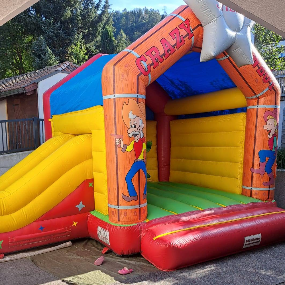 Sie ist wie alle unsere Hüpfburgen mit einem Dach ausgestattet, welches neben dem Witterungsschutz vor allem der Sicherheit dient und ein Überklettern unmöglich macht!